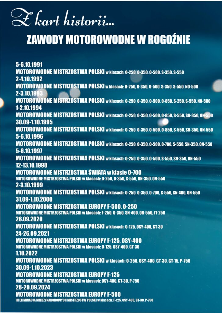 Motorowodne widowisko na wodach Jeziora Rogoźno, kontynuowane z pasją prze wiele lat na stałe wpisało się w kalendarz wydarzeń sportowych regionu, tworząc swoją unikalną i piękną historię.